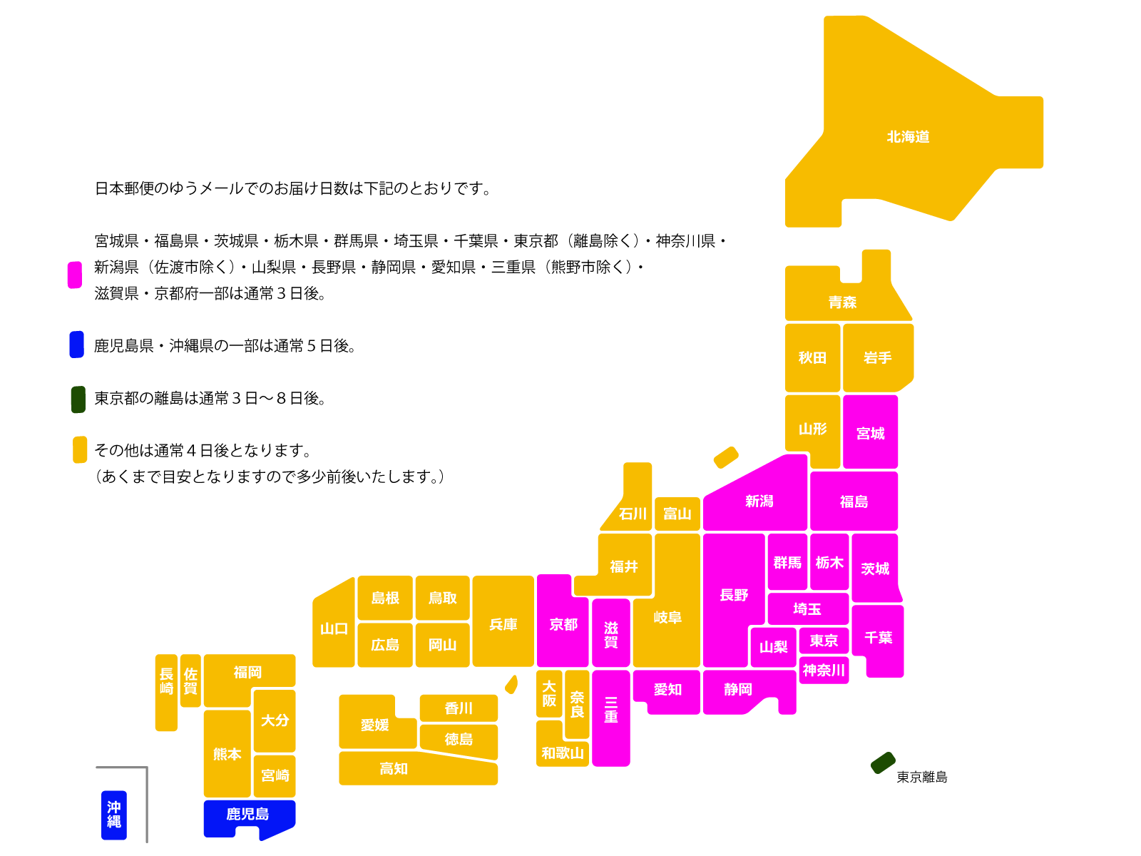 | 宮城県・福島県・茨城県・栃木県・群馬県・埼玉県・千葉県・東京都(離島除く)・神奈川県・新潟県(佐渡市除く)・山梨県・長野県・静岡県・愛知県・三重県(熊野市除く)・滋賀県・京都府一部 | 通常3日後 |