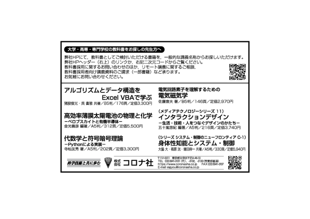 最後に,本テキストの構想から完遂までに10年の歳月を要しました.この長い間,コロナ社の方々に温かく見守っていただき,忍耐強くご支援を賜ったおかげによりまして完成に至りました.ここに改めて深く感謝を申し上げます.ありがとうございます.
