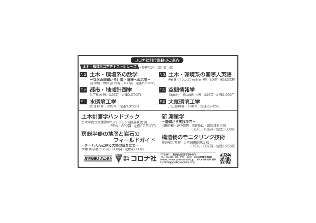 土木学会土木計画学研究委員会設立50周年,コロナ社創立90周年記念出版。土木計画学に関する広範囲な知識の備えとその活用,行動・検証力をとりまとめ,今までの土木計画学分野の成果とこれからの指針を示した必携ハンドブック。