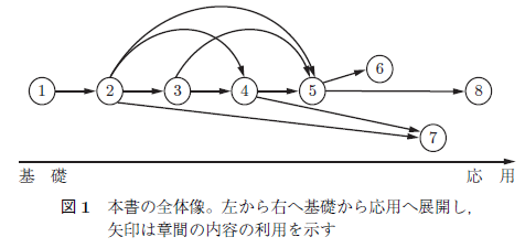 本書の構成はつぎのとおりであり,図1がその全体像である:第1章は集合・写像の基礎事項を整理し,さらに線形代数の教科書ではあまり扱われない商集合を導入する。商集合は抽象的な概念ではあるが,本書全体の理解において重要な役割を果たすため,特に丁寧に解説する。第2章では本書全体を通して中核となるユークリッド整域を中心に,代数学の基礎概念を詳述する。第3章では加群と準同型写像を取り上げ,ベクトル空間との違いを明確にしつつ,加群論の基本的枠組みを与える。第4章では整域上の行列式を定義から性質に至るまで体系的に構築し,後続の議論に備える。第5章ではエルミート標準形,スミス標準形,ジョルダン標準形という三つの標準形を取り上げ,特にジョルダン標準形と複素ベクトル空間の直和分解の関係を詳しく論じる。第6章では非負行列の一般論を展開し,その応用としてマルコフ連鎖を導入し,さらにグラフラプラシアンのクロン縮約について詳細に解説する。第7章では多項式の積とFFTの関係を線形代数学的観点から明らかにし,さらにFFTの深層学習モデルへの応用に触れる。最後に第8章では,本書で整えた「広義の線形代数」が具体的に数理工学のどのような分野に活用されるかを三つの視点から示す。すなわち,トポロジカルデータ解析,代数解析学に基づくシステム制御,そして耐量子暗号の有力候補である格子暗号である。