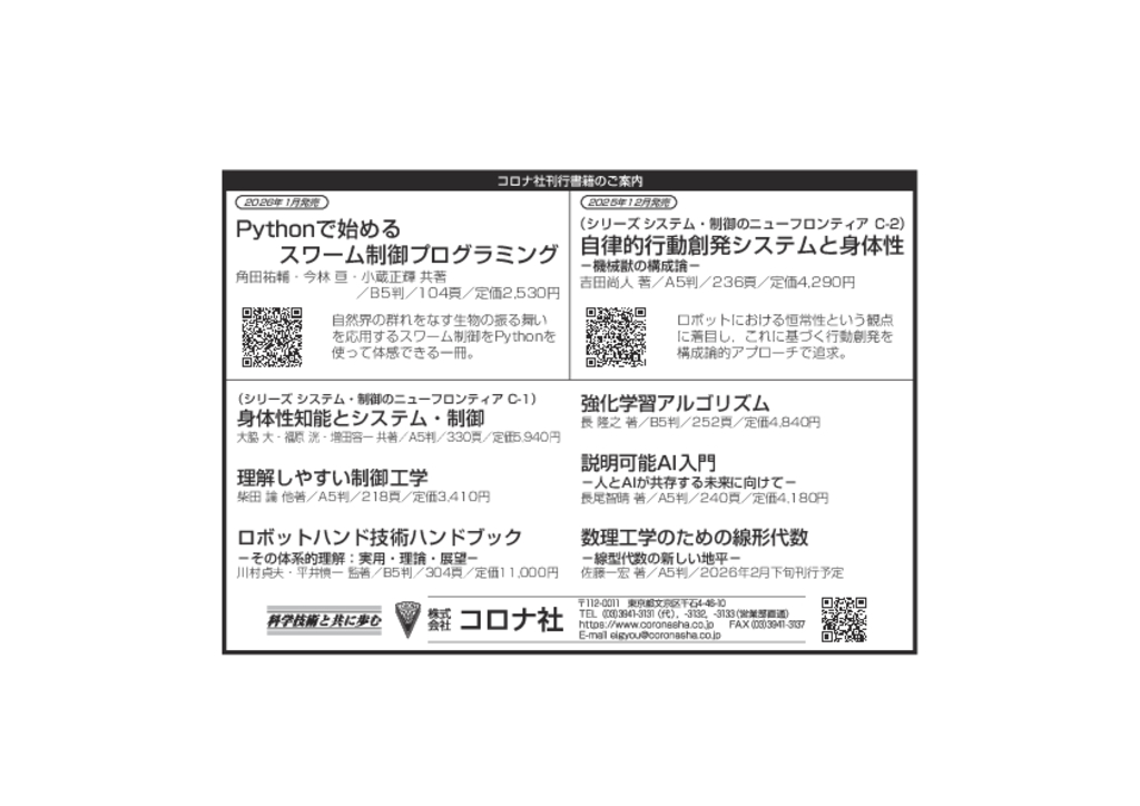 謝辞:本書は井上大輔氏(株式会社豊田中央研究所数理工学研究領域),岩出大毅氏(東京大学大学院情報理工学系研究科),梅津光汰氏(東京大学大学院情報理工学系研究科),坂元佑弥氏(株式会社フィックスターズ),先名健一氏(合同会社QRテクノロジー)のコメントによってさまざまな点で改善されました。ここに深く感謝申し上げます。また,本書の執筆が長期にわたり,締切延長にご理解を賜りながら,終始温かくご支援くださったコロナ社の皆様に心より御礼申し上げます。そのご寛容とご理解があってこそ,本書を世に出すことができました。最後に,執筆を支えてくれた妻と娘には,日々の励ましに心から感謝します。